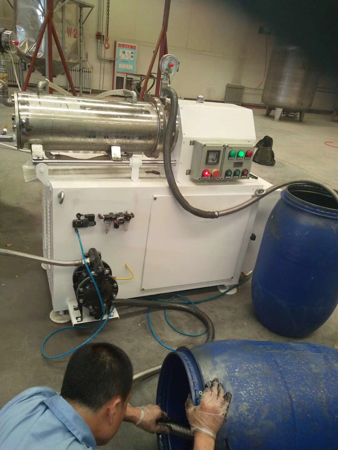 是利用料泵將經過攪拌機預分散潤濕處理后的固-液相混合物料輸入筒體內,物料和筒體內的研磨介質一起被高速旋轉的分散器攪動,從而使物料中的固體 微粒和研磨介質相互間產生更加強烈的碰撞、摩擦、剪切作用,達到加快磨細微粒和分散聚集體的目的。研磨分散后的物料經過動態分離器分離研磨介質,從出料管流出。臥式砂磨機特別適合分散研磨粘度高而粒度要求細的產品。